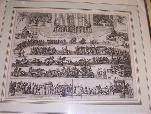 grande stampa di cm 41,6 x 31,7 raffigurante varie scene della morte e del solenne funerale di papa Alessandro VIII, col corteo che si snoda dal Palazzo Pontificio di Monte Cavallo fino in S. Pietro. Stampa nitida e priva di fioriture, con cornice in legno beige ed oro, passepartout e vetro.