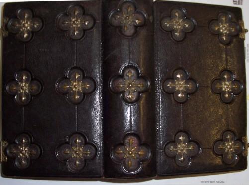 in 16° (cm 14x8,5), pp. VIII, 940, elegante legatura in p/pelle marrone con intarsi al ds. e ai piatti e borchiette decorative, tagli dorati, 2 fermagli (di cui 1 mancante); ritratto di S. Cunegonda in antiporta, grande front. inciso, Duomo di Milano inciso al 2° front. e 14 piccole inc. n.t. Custodia (un po' malandata) in cartone decorato blu. 13^ ediz. Esercizi spirituali, novene e preghiere per ogni periodo dell'anno. Esemplare bello e fresco.