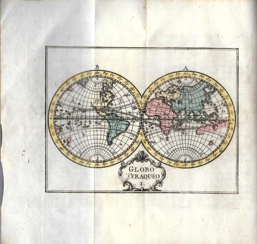 in 8° (cm 15,5x10), pp. XXVIII, 1, 325, 3 b.; leg. coeva p/pelle maculata, tit. in oro su tass. al ds., tagli spruzz. Grazioso atlante portatile che descrive il mondo attraverso domande e risposte e lo illustra con 24 cartine geogr. incise in rame e acquerellate a mano, ripiegate f.t. che raffigurano il mondo, i continenti, gli Stati europei e il Sistema cosmico; rinforzo alla sguardia ant. e lievi sporadiche fior. Molto raro.