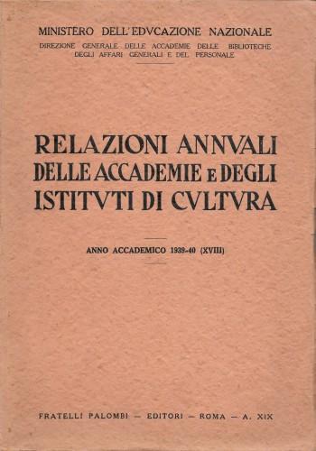 in 8°, pp. IX, 3 nn., 1133, bross. edit.; raccolta delle relazioni sulle attività culturali e lezioni d'alto livello tenute dalle accademie ed istituti italiani, con indice alfabetico per città e per denominazione. Bordi ingialliti dal tempo.