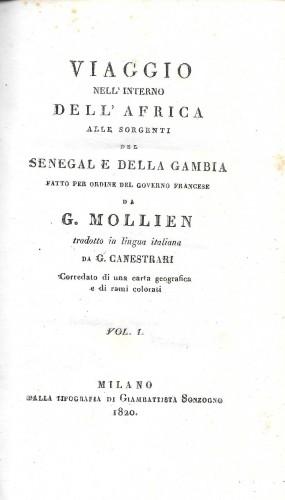 prima ediz. ital., in 8° piccolo (cm 16,5x10), pp. xiv, 267, 1 b., 269, 1; leg. coeva m/pelle con angoli, tit. in oro su tass. al ds. e fregi, tagli spruzz. Collana: Raccolta de' viaggi più interessanti eseguiti nelle varie parti del mondo tanto per terra quanto per mare dopo quelli del celebre Cook, e non pubblicati fin ora in lingua italiana. Trad. di G. Canestrari, con 6 tavv. in rame acquerellate, ed 1 grande c. geogr. ripiegata in fine. Ufficiale di marina, grande viaggiatore e celebre esploratore, sulle orme di Mungo Park, scoprì le sorgenti del Gambia e del Senegal, inviato in America percorse tutto il territorio della Colombia, e fu Console di Francia ad Haiti dal 1831 al 1848. Lievi fior. e piccolo strappo alla cartina, ma voll. ben conservati. Raro.