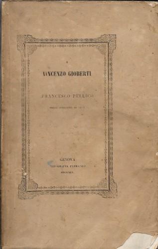 in 8°, pp. 425, 1, bross. edit. con fregi tip.; l'A., fratello di Silvio Pellico, difende la Compagnia di Gesù dalle critiche espresse dal Gioberti nella sua opera "Del primato morale e civile degli italiani", mettendo in rilievo il punto di vista religioso e sottolineando il ruolo dei Gesuiti nell'educare ed aiutare le popolazioni. Fioriture sparse e piccola mancanza all'angolo inf. del piatto ant.