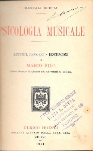 prima ediz., in 16°, pp. XIX, 1 b., 259, 1 b., 64 di catalogo dei Manuali Hoepli; p/tela edit. celeste con tit. in nero, tagli rossi. Interessante saggio sui suoni e la musica; dall'indice: L'arte dei Suoni; La Musica e il Senso; La Musica e il Sentimento; La Musica e l'Intelletto; La Musica e l'Ideale; La Poesia e la Prosa musicali. Lievi tracce d'uso.