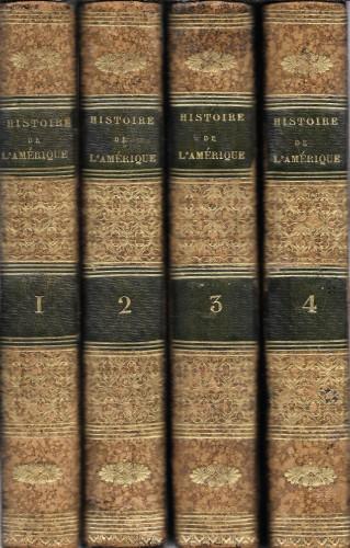 in 8°, pp. XL, 384; 453; 457; 486; p/pelle marmor. coeva, ricchi fregi in oro al ds. e tit. su tass., tagli e sguardie marmor.; quatrième édition contenant les neuvème et dixième livres; revue et corrige sur la dernière édition anglaise et accompagnée de notes puisées dans les ouvrages de MM. de Humboldt, Bulloch, Warden, Clavigero, Jefferson, etc."; completa della 4 tavv.: 2 grandi c. geogr. dell'America settentrionale e meridionale nel 1° vol., 2 c. geogr. dell'America centrale ed 1 tav. cronologica dei messicani, nel 3° vol., disegnate ed incise da Ambrosie Tardieu (1788-1841); piccole sbucc. alle leg. ma ottimi voll.