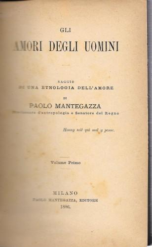 prima ediz., in 16°, pp. 8 nn., 269; 5 nn., 259, 1; leg. coeva p/tela rossa muta. Approfondito saggio sull'amore, le feste della pubertà, pudore e castità, la scelta della sposa o dello sposo, gli usi sessuali, fedeltà e adulterio, prostituzione, di molti popoli e razze umane. Poche sottolineature a matite e qc. rinforzo al margine inf. di poche pp. Carta un po' ingiallita dal tempo, qc. fior. e qc. sottolineatura ma buon esemplare.