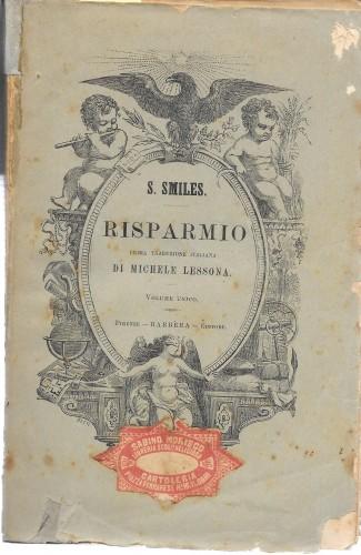 in 8°, pp. XXIII, 410, bross. edit. ill. Prima traduz. ital. di Michele Lessona, 5^ ediz.; tutto sul risparmio con esempi di uomini illustri. Piccole mancanze alla bross., rinforzo al ds. e qc. fior.