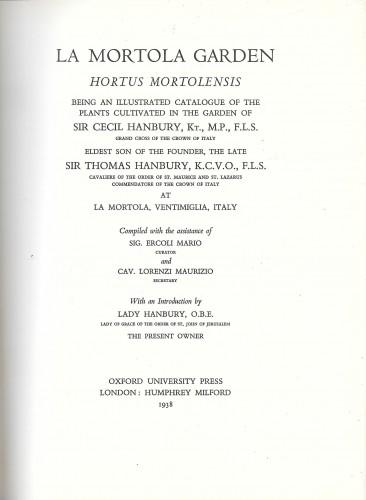 prima ediz., in 8° grande (cm 25,5x19), pp. LXVI, 158, 64 tavv. f.t. Legatura edit. p/tela verde con tit. in oro, foto della Loggia a colori in antiporta. Catalogo illustrato delle piante coltivate nel giardino di Sir Cecil Hanbury, figlio maggiore del fondatore, Sir Thomas Hanbury a La Mortola. Compilato con l'assistenza di Mario Ercoli e Maurizio Lorenzi, ampia introduzione di Lady Dorothy Hanbury, all'epoca proprietaria della tenuta, nelle pp. a numerz. romana. Le 64 tavv. f.t. comprendono i ritratti di Sir Cecil e di Sir Thomas, 58 belle foto b/n di vegetazione, vedute e particolari del giardino, 2 grafici della piovosità dal 1900 al 1930, 2 piantine della Mortola nel 1914 e nel 1937. Interessante e non comune, in ottimo stato di conservazione.