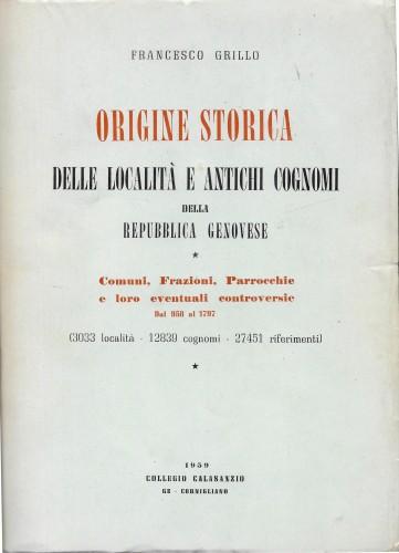 in 8°, pp. 523, 5 nn., bross. edit. Interessante saggio sull'origine dei nomi di Comuni, Frazioni, Parrocchie e loro eventuali controversie dal 958 al 1797, con 3033 località, 12839 cognomi e 27451 riferimenti. Alcune lettere e vecchi articoli di quotidiani dell'epoca conservati nel vol. Solo margini un po' ingialliti dal tempo, per il resto ottimo.
