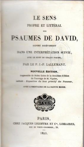 in 16°, pp. xlviij, 624, leg. coeva m/pelle nera, ds. a nervi con tit. in oro, sguardie marmor. "Nouvelle edition, Augmentée de Notes tirées de la deuxieme Edition de l'ouvrage de M. Viguier, intitulé: Exposition du Sens primitif des Psaumes". Testo latino e francese a fronte, piccole incisioni. Esemplare fresco, solo lievi tracce d'uso alla leg. Molto buono.