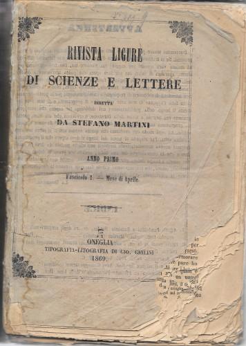 in 8°, pp. 344, leg. in cartone muto con dorso in nastro telato blu; conservate le bross. originali. Rivista che raccoglie articoli su vari aspetti della cultura letteraria e scientifica, con biografie di autori onegliesi. Il primo fascicolo, aprile, manca dell'angolo inf. esterno delle prime 16 pp. con perdita di testo; anche il secondo fascicolo, maggio, ha piccole mancanze ma senza perdita di testo. Lievi aloni e ingiallimenti ad alcune pp. Rivista ormai introvabile nelle sue prime annate.